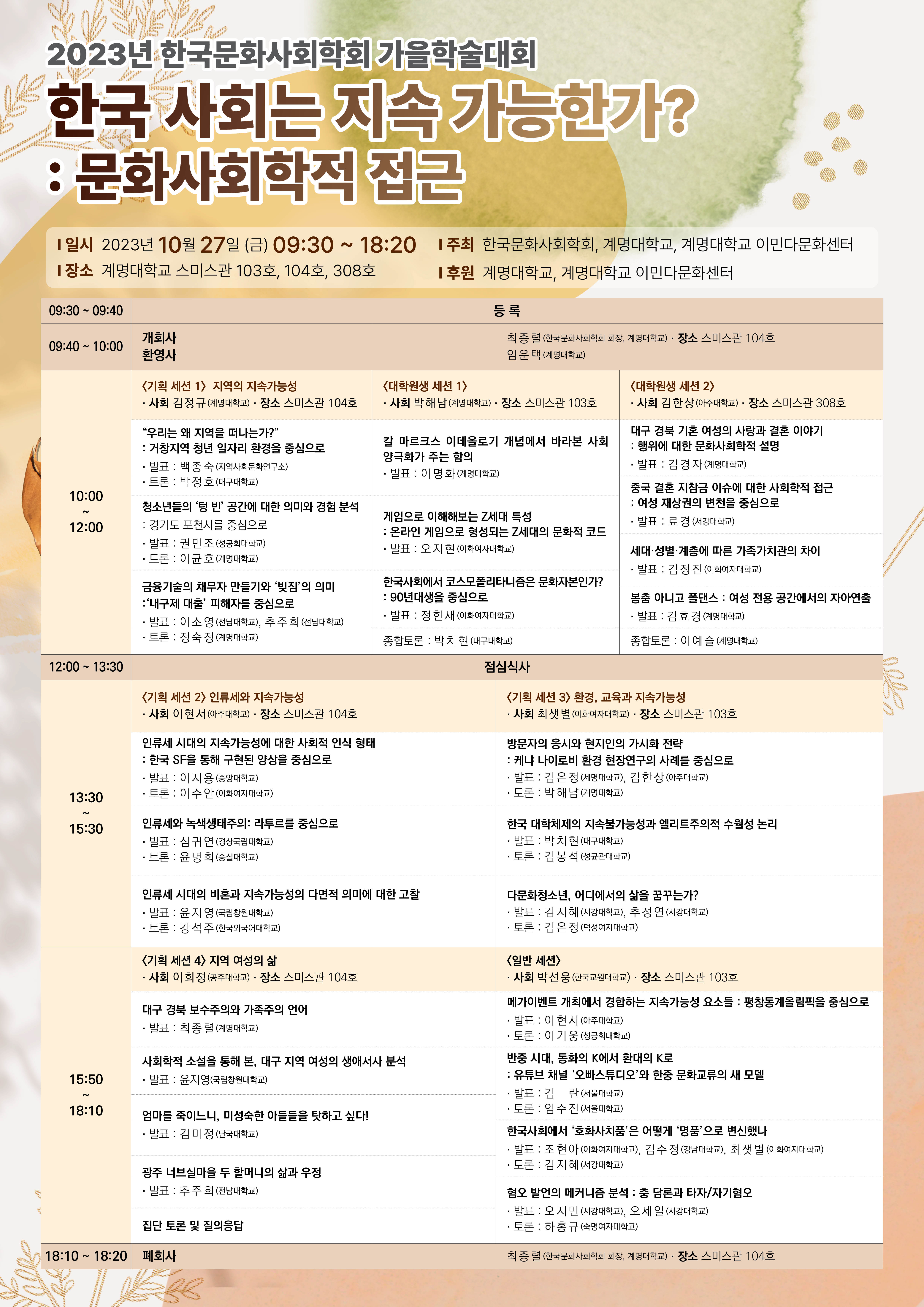1. 일시: 2023.10.27.(금) 09:30 ~ 18:202. 장소: 계명대학교 스미스관 103호, 104호, 308호3. 주제: 한국 사회는 지속 가능한가? : 문화사회학적 접근